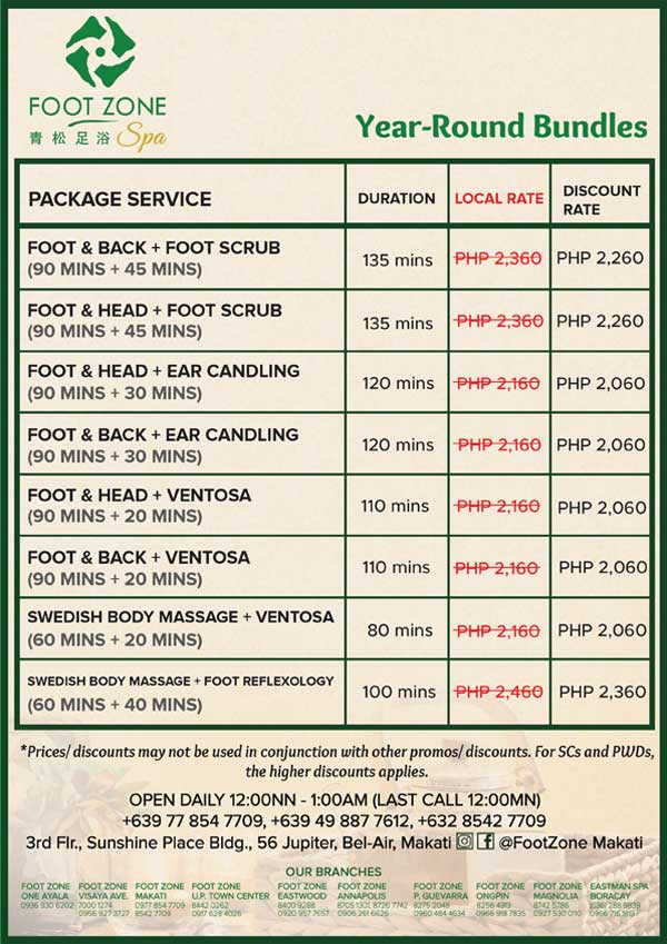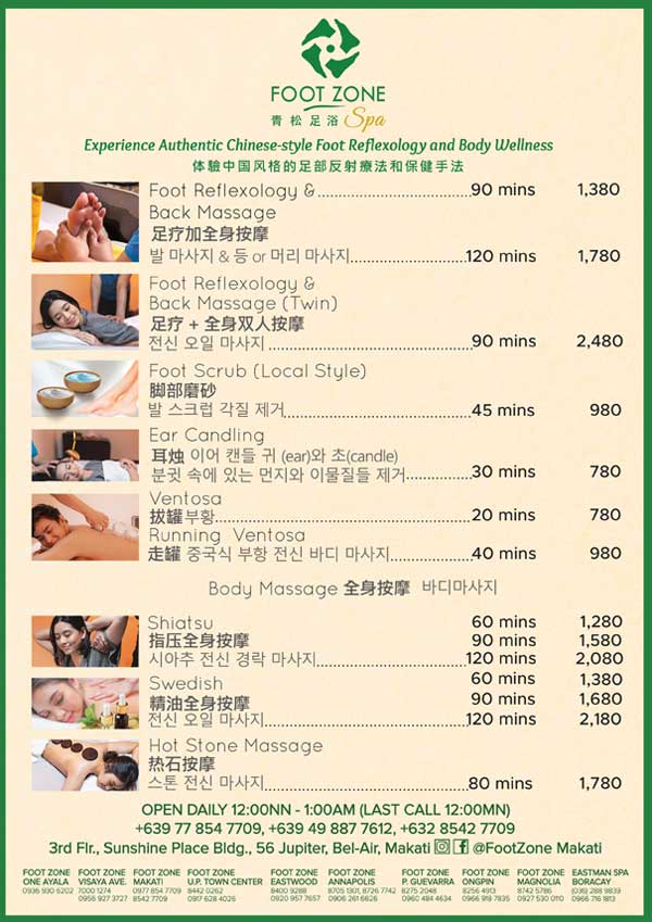 See More Locations Foot Zone Makati 3rd flr., Sunshine Place Bldg., 56 Jupiter, Bel-Air, Makati, Metro Manila Monday – Sunday 12pm – 1am 0977 854 7709 (02) 8542 7709 View Menu Services View Packages To book appointments, contact via viber Viber Foot Zone Makati